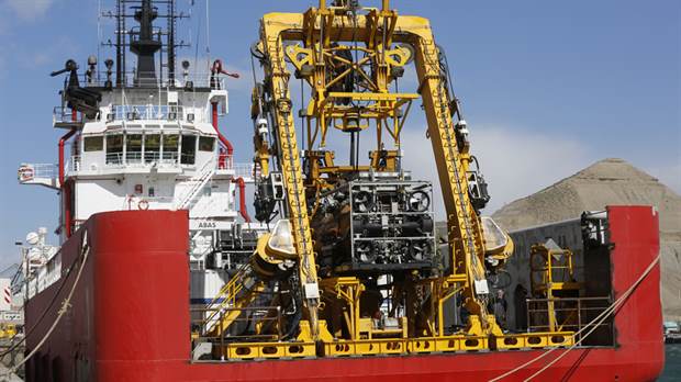 Durante la noche se realizaron todas las pruebas necesarias para garantizar el funcionamiento óptimo del brazo hidráulico que hará descender al minisubmarino al agua en alta mar.
