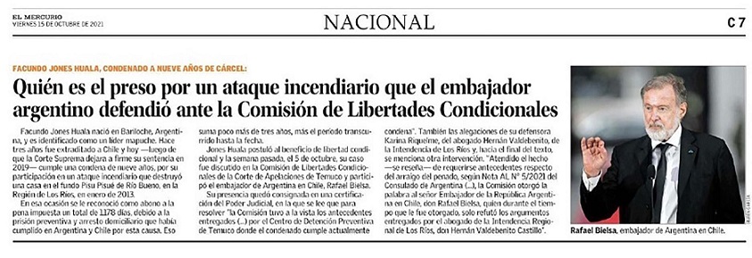 Hace uno días nos desayunamos con la irrisoria (por no decir triste) noticia de que el embajador argentino, Rafael Bielsa, fue a una audiencia judicial en Chile a pedir por la libertad del líder mapuche, Facundo Jones Huala, detenido y condenado en el vecino país por crímenes contra vecinos cometidos en nombre del pueblo mapuche. Huala, no sólo cometió crímenes en el país trasandino sino también en Argentina, por lo que no se entienden los motivos que llevaron a un diplomático de nuestro gobierno a pedir por su liberación.