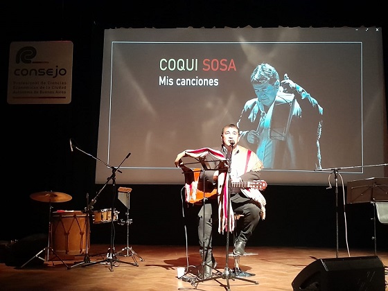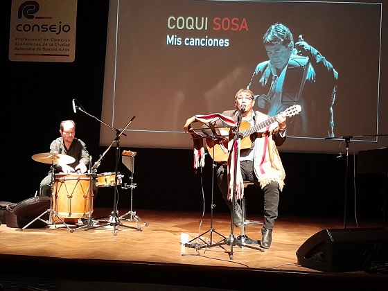 El tucumano fue presentado por el coordinador de la Comisión de Acción Cultural de ese cuerpo colegiado de profesionales, Luis A. Barrera, y sólo acompañado por su guitarra y ataviado con el poncho que nos identifica, comenzó su actuación.