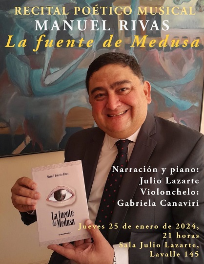Con su extraordinaria capacidad oratoria, Lazarte narrará este jueves 25 de enero, desde las 21, en la Sala homónima ubicada en Lavalle 145, algunos cuentos del libro “La fuente de Medusa”, del escritor y periodista tucumano Manuel Rivas.