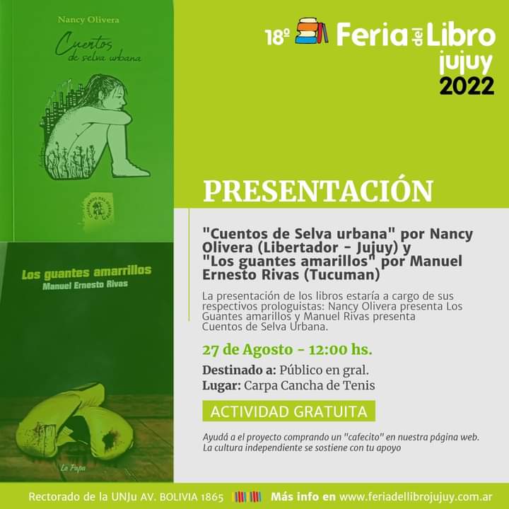 El sábado 27 de agosto, a las 12, en la Cancha de Tenis del Rectorado de la Universidad Nacional de Jujuy (UNJu), se dará la doble presentación de los libros “Cuentos de selva urbana”, de Nancy Olivera y “Los guantes amarillos”, de Manuel Rivas.