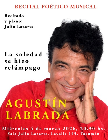 - “La soledad se hizo relámpago”, de Agustín Labrada. A las 20.30, en Sala Lazarte, Lavalle 145 de San Miguel de Tucumán. Recitado y piano: Maestro Julio Lazarte.