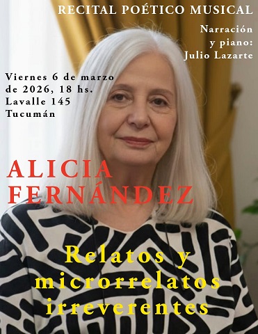 - “Relatos y microrrelatos irreverentes”, de Alicia Fernández. A las 18, en Sala Lazarte, Lavalle 145 de San Miguel de Tucumán. Narración y piano: Maestro Julio Lazarte.