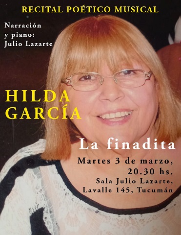 - “La finadita”, de Hilda García. A las 20.30, en Sala Lazarte, Lavalle 145 de San Miguel de Tucumán. Narración y piano: Maestro Julio Lazarte.