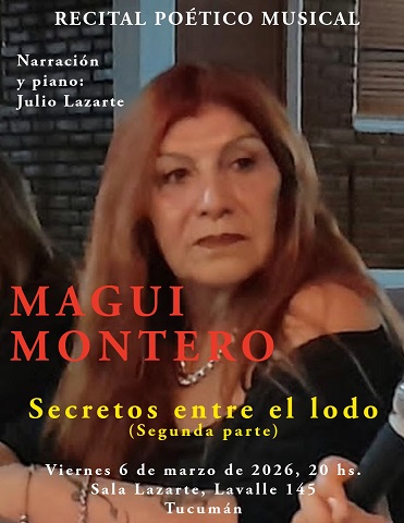 - “Secretos entre el lodo” (Segunda Parte), de Magui Montero. A las 20, en Sala Lazarte, Lavalle 145 de San Miguel de Tucumán. Narración y piano: Maestro Julio Lazarte.