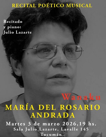 - “Wanaku”, de María del Rosario Andrada. A las 19, en Sala Lazarte, Lavalle 145 de San Miguel de Tucumán. Recitado y piano: Maestro Julio Lazarte.