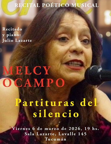 - “Partituras del silencio”, de Melcy Ocampo. A las 19, en Sala Lazarte, Lavalle 145 de San Miguel de Tucumán. Recitado y piano: Maestro Julio Lazarte.