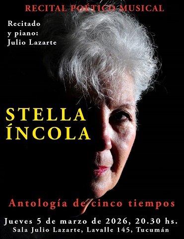 - “Antología de cinco tiempos”, de Stella Íncola. A las 20.30, en Sala Lazarte, Lavalle 145 de San Miguel de Tucumán. Recitado y piano: Maestro Julio Lazarte.