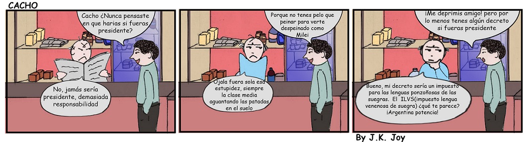 Actualidad A Cacho no le gustaría ser Presidente 8 octubre, 2025 Compartir en Facebook Compartir en Twitter 🔊 Escuchar la entrada El personaje principal de la tira cómica de Diario Cuarto Poder , Cacho, Creado por J.K. Joy , tras la pregunta de su amigo se niega a ser presidente, solo un decreto quizás lo haría cambiar Comments Comentarios