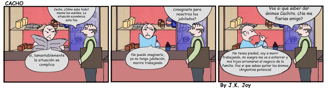 El personaje principal de la tira cómica de Diario Cuarto Poder , Cacho, Creado por J.K. Joy , se deprime por pensamientos que descubre por culpa de su amigo Juan