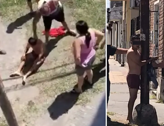 Ya atado en un poste de luz con una piola y semidesnudo (lo dejaron en calzoncillos), le empezaron a pegar: le querían quebrar los dedos y lo azotaron con una soga.