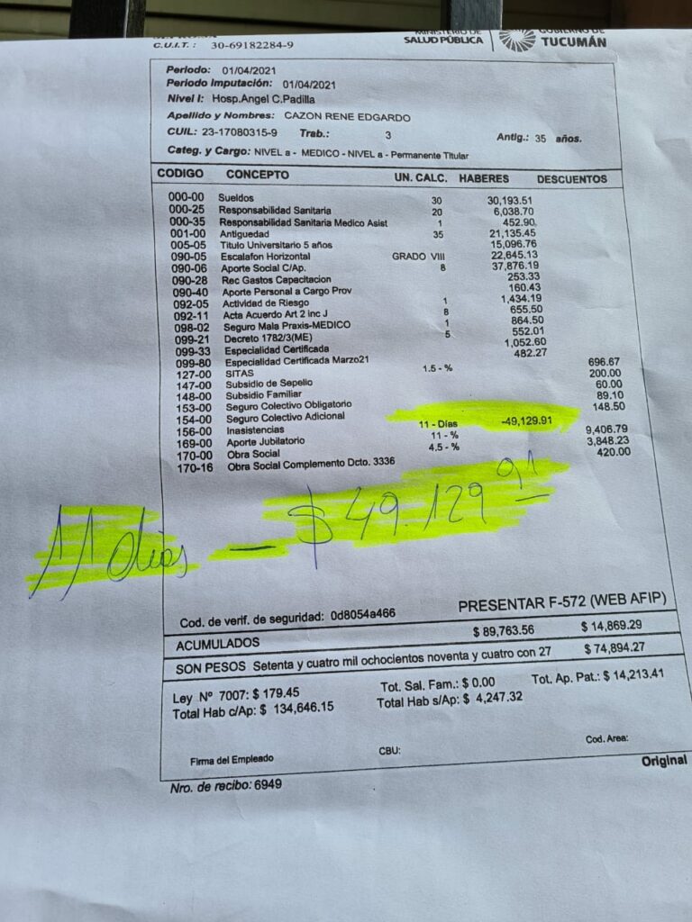 SITAS acusa directamente a Roxana Chahla, ministra de salud y Luis Medina Ruiz, secretario del SIPROSA, de “sustraer “montos mayores al 40 % del sueldo de los trabajadores de la salud nucleados en el gremio.