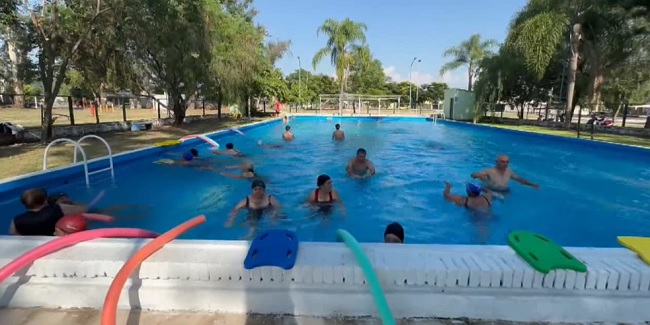A cargo del Profesor Ramón Santillán, un grupo de adultos mayores hacen uso de la pileta del complejo municipal donde hacen actividades en el agua.