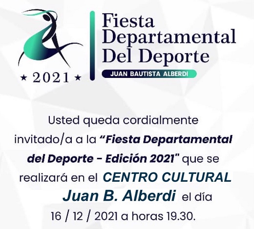 Puede ser una imagen de texto que dice "Fiesta Departamental Del Deporte JUAN BAUTISTA ALBERDI *2021* Usted queda cordialmente invitado/a la "Fiesta Departamental del Deporte- Edición 2021" que se realizará en el CENTRO CULTURAL Juan B. Alberdi el día 16 12 2021 a horas 19.30. Elegante Sport iTe esperamos! Dirección de Deportes AUANBAUTISTA BAUTISTA INTENDENCIA SANDRA FIGUEROA"