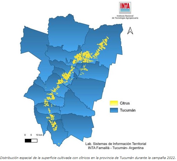 Los datos obtenidos determinaron que la superficie total implantada con cítricos en Tucumán durante la campaña 2022 es de 48.094 ha. Burruyacú presenta la mayor superficie cultivada de la provincia con el 34,23%; y, junto a los departamentos Tafí Viejo, Famaillá, Monteros, Chicligasta y La Cocha concentra casi el 80% de la superficie total .