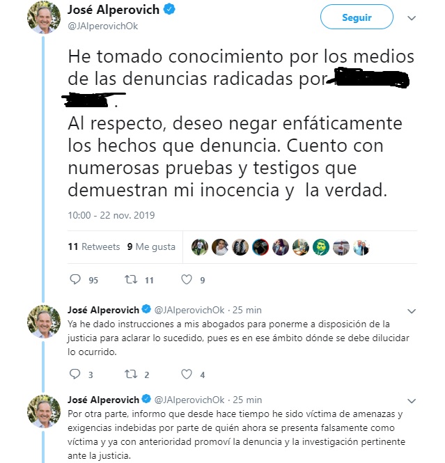 “He tomado conocimiento por los medios de las denuncias radicadas .Al respecto, deseo negar enfáticamente los hechos que denuncia. Cuento con numerosas pruebas y testigos que demuestran mi inocencia y la verdad”, escribió en su cuenta de Twitter.
