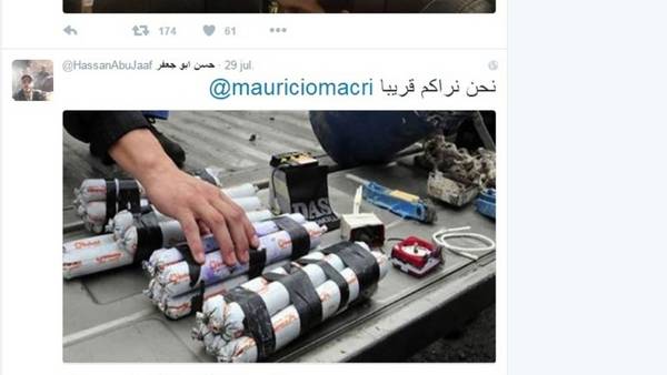 “Nos vemos pronto @mauriciomacri”, decía uno de los mensajes. El tweet, acompañado por una foto de explosivos, alertó a las autoridades. Desde una cuenta de la red social, y con frases escritas supuestamente en árabe, esta madrugada empezaron a amenazar con posibles atentados en la ciudad de Buenos Aires y contra el presidente de la Nación, justo en el día de su visita a la Rural. En pocas horas, lograron detener a dos jóvenes que están declarando a la Justicia.