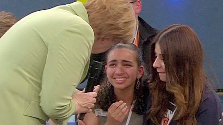 Reem, la adolescente de 14 años que con una sonrisa y en un perfecto alemán le acababa de decir que tan solo quería cumplir su sueño de seguir estudiando y vivir como cualquiera de sus compañeros de clase, se desmoronó ante las palabras de la canciller. Rápidamente, Merkel se acercó para consolarla y acariciarla, por lo que el hashtag #MerkelStreichelt (Merkel acaricia) fue tendencia en Alemania.