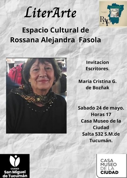 Letras de Fuego / Noticias. No sorprende la llegada de la autora de “Cuentos de la frágil humanidad”, María Cristina Guerrero, a LiterArte Espacio Cultural de Rossana Alejandra Fasola. Este sábado, a las 17, en la Casa Museo de la Ciudad.