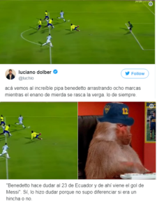 Lo hinchas de Boca Juniors alabaron en las redes la actuación de su número 9: Dario Benedetto, aduciendo que fue quien posibilitó a Lio Messi convertir los tres goles con los que Argentina derrotó a Ecuador. Entonces los de River no perdieron tiempo y estallaron en las redes con memes muy originales e imperdibles, sobre todo con el mono con la gorrita de la Doce de Boca chateando en las redes!!!