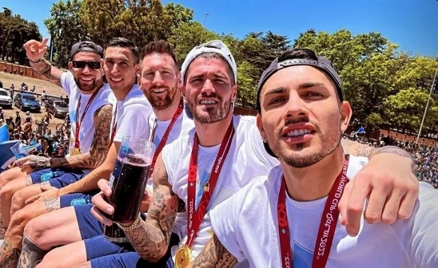 El mediocampista Leandro Paredes publicó una foto junto a Rodrigo De Paul, Lionel Messi, Angel Di María y Nicolás Otamendi y desató la locura en las redes sociales durante el inicio de la caravana de los campeones del mundo.