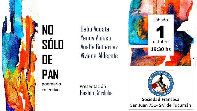 Poesía de alto vuelo / Próxima presentación. Este sábado, desde las 19.30, en la Sociedad Francesa, se presentará el poemario colectivo “No solo de pan”, de los escritores Gabo Acosta, Yenny Alonso, Analía Gutiérrez y Viviana Alderete.