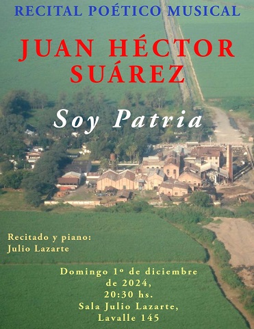 - Domingo 1 de diciembre, desde las 20.30, “Soy Patria”, de Juan Héctor Juárez. Recitado y piano: Julio Lazarte.