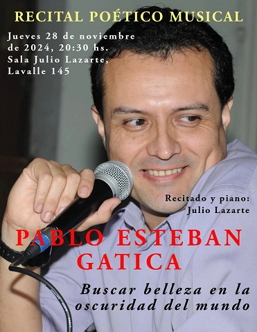 - Jueves 28 de noviembre, desde las 20.30, “Buscar belleza en la oscuridad del mundo”, de Pablo Esteban Gatica. Recitado y piano: Julio Lazarte.