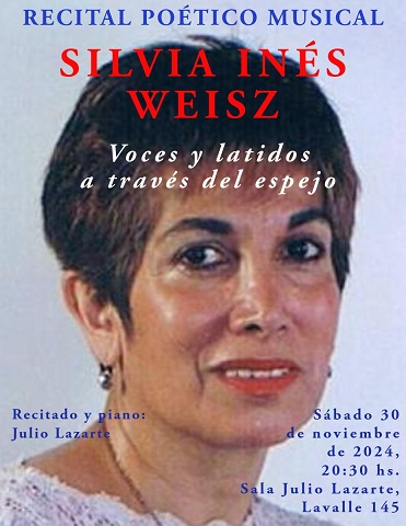 - Sábado 30 de noviembre, desde las 20.30, “Voces y latidos a través del espejo”, de Silvia Inés Weisz. Recitado y piano: Julio Lazarte.