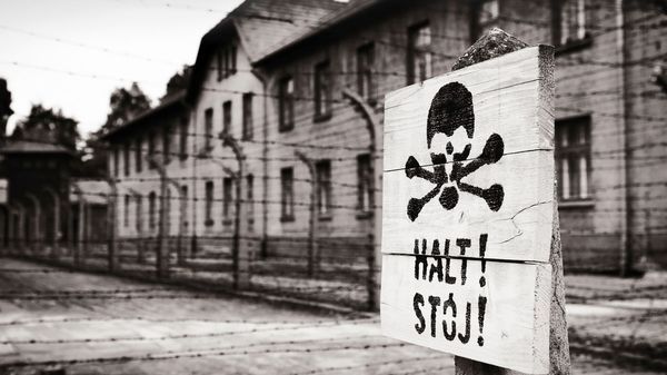 Un cartel de “¡Alto, pare!” en el campo de exterminio de Auschwitz