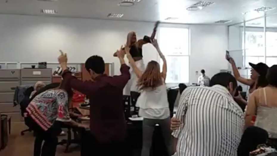 Las imágenes permiten ver a funcionarios y empleados que festejan en sus oficinas, entre los que sobresale una mujer rubia que parece ser la que anima a los demás, bailando incluso sobre un escritorio.