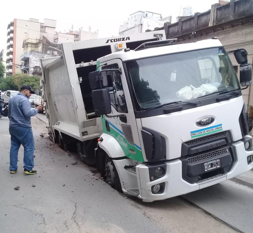 Un camión recolector perteneciente a la Dirección de Higiene Urbana de la Municipalidad de San Miguel de Tucumán quedó hundido en uno de sus lados al caer un extenso bache, en calle Marcos Paz al 700.