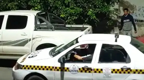 El video filmado por un vecino muestra como un taxi se detiene junto a la camioneta, y un joven desciende y se apropia de la rueda.