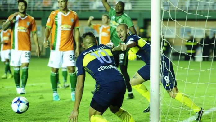 La protesta por el error arbitral todavía no se había disipado en el aire del Florencio Sola cuando Boca pegó el primer grito oficial de 2017: a los 15 minutos el colombiano Frank Fabra bordó una muy buena jugada individual por la izquierda y su centro al corazón del área chica, que no pudo ser cortado por el colombiano Mauricio Arboleda, fue empujado a la red por Darío Benedetto.