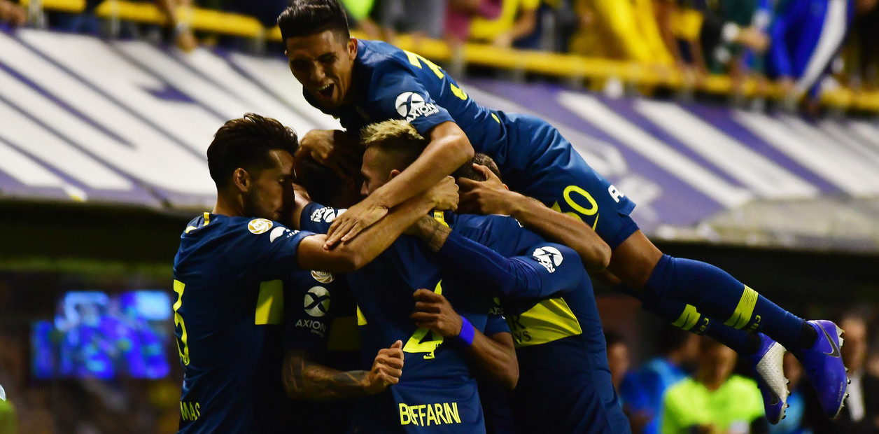 Bebelo Reynoso salta sobre sus compañeros en el festejo del 1-0 de Boca, obra de Zárate. (Marcelo Carroll)