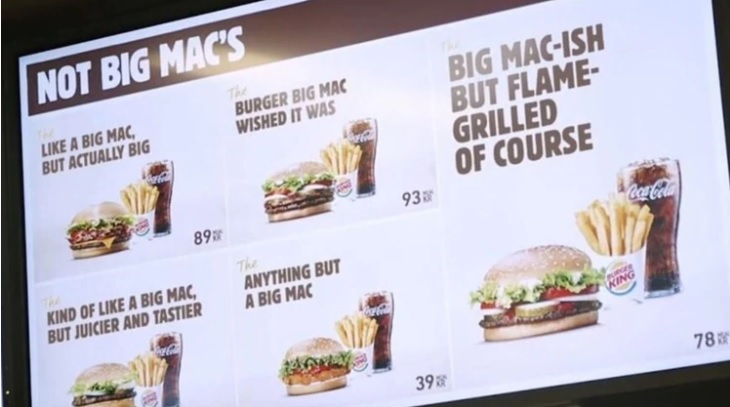 “Como un Big Mac, pero realmente grande”; “La hamburguesa que el Big Mac desearía haber sido”; Como un Big Mac, pero más jugosa y más sabrosa” y “Cualquier cosa excepto un Big Mac”. Estas fueron algunas de las frases que utilizó Burger King en los afiches que empapelaron sus locales de comida rápida en Europa.
