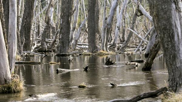 Hoy el Parque Nacional Tierra del Fuego parece dinamitado: los árboles carcomidos y volteados se han convertido en la postal de un espacio que solía presentar otro paisaje.