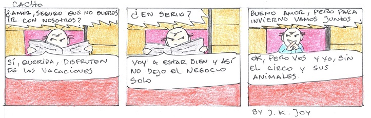 ¿Puede un hombre quedarse feliz sin vacaciones en familia? La respuesta la tiene Cacho, el personaje creado por J.K. Joy, quien en esta oportunidad se queda para atender el negocio y pasar unos días de tranquilidad, sin su esposa, su suegra, su nuera y el hijo.