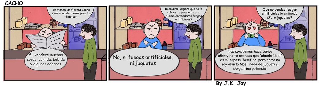 El personaje principal de la tira cómica de Diario Cuarto Poder , Cacho, Creado por J.K. Joy , venderá varias cosas por las fiestas pero nada de fuegos artificiales y juguetes