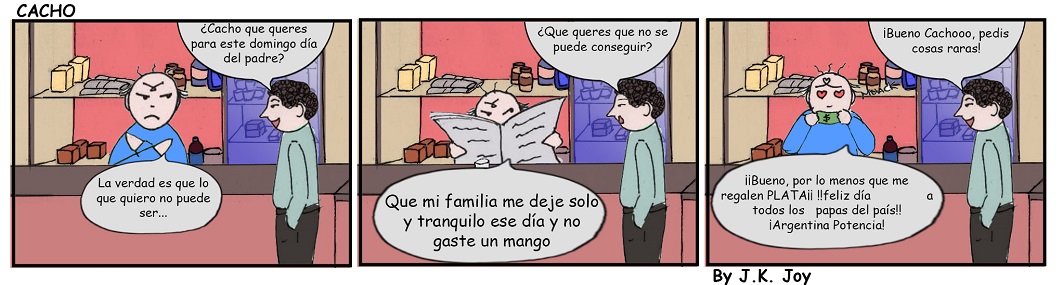 Actualidad Cacho quiere pasar el día del padre en paz 16 junio, 2024 Compartir en Facebook Compartir en Twitter 🔊 Escuchar la entrada El personaje principal de la tira cómica de Diario Cuarto Poder , Cacho, Creado por J.K. Joy ,pide mucho de su familia en el día del padre. ¿Podrá conseguir su regalo anhelado? ¡Feliz día a todos los padres del país! Comments Comentarios