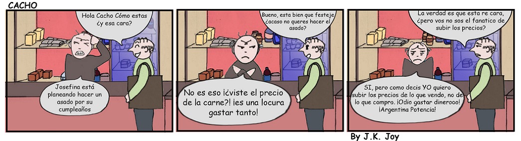 El personaje principal de la tira cómica de Diario Cuarto Poder , Cacho, Creado por J.K. Joy , le dice a su amigo que no esta para asado con el precio de la carne, ni siquiera para el cumpleaños de su esposa