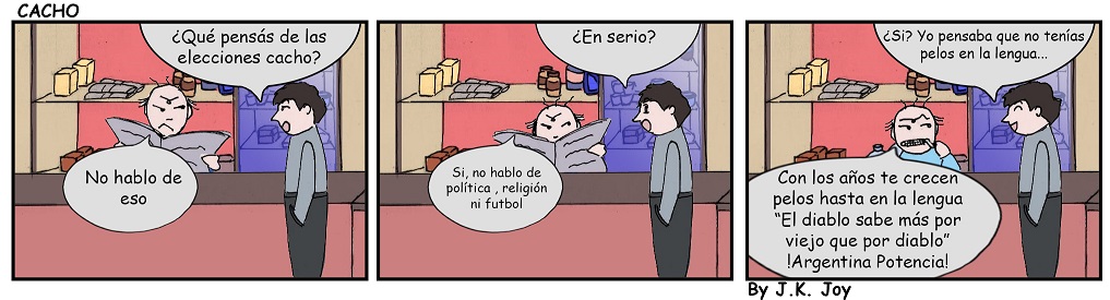 El personaje principal de la tira cómica de Diario Cuarto Poder , Cacho, Creado por J.K. Joy , sin pelos en la lengua sobre política. ¡Argentina potencia!