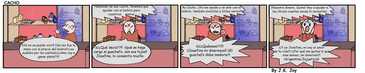 El personaje principal de la tira cómica de Diario Cuarto Poder , Cacho, Creado por J.K. Joy ,sufre con la inflación y su guachafo hijo.