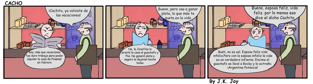 El personaje principal de la tira cómica de Diario Cuarto Poder , Cacho, Creado por J.K. Joy ,vuelve de las vacaciones más abatido que nunca, perdió plata y el panorama no mejora