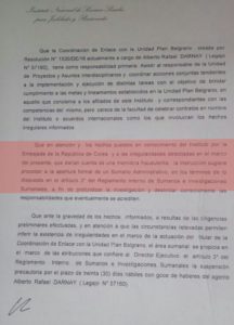 En el sumario 0053 que ordena el ex titular del Pami, Carlos Regazzoni el 11 de enero de 2017, se consigna: “Que en atención y los hechos puestos en conocimiento del Instituto por la Embajada de la República de Corea y a las irregularidades detectadas (…) que darían cuenta de una maniobra fraudulenta, la instrucción sugiere proceder a la apertura formal de un sumario administrativo…” (El sumario determinó la suspensión por 30 días del coordinador de Enlace con la Unidad Plan Belgrano, Alberto Darnay).
