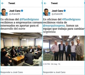 En el diario La Gaceta del 26 de febrero de 2017 (El Plan Belgrano se despega de gestiones en Corea), desde el Plan Belgrano reconocen que el alerta se encendió en octubre cuando recibieron un mail de la Oficina Comercial de la Embajada de Corea del Sur en Buenos Aires, en donde se consultaba a Cano por tres presuntos funcionarios que habían viajado a ese país para firmar convenios con empresas locales. (Se refieren a Alberto Darnay, Osvaldo Barreñada y Octavio Accardi).