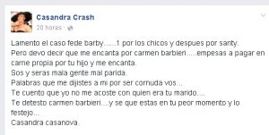 Te cuento que yo no me acoste con quien era tu marido….Te detesto carmen barbieri….y se que estas en tu peor momento y lo festejo… Casandra casanova.