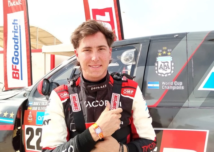 Juan Cruz Yacopini junto al ploteo de las tres estrellas y el escudo de la AFA en su Toyota Hilux.En tanto que el matrimonio de Nicolás Cavigliasso y Valentina Pertegarini tienen looks alusivos a la Selección. Él lleva en el costado izquierdo la bandera que popularizó Emiliano “Dibu” Martínez y ella un mechón celeste y blanco. Ambos corren en los UTV que son los vehículos areneros y están en la categoría T4, que son los vehículos de serie preparados para correr.