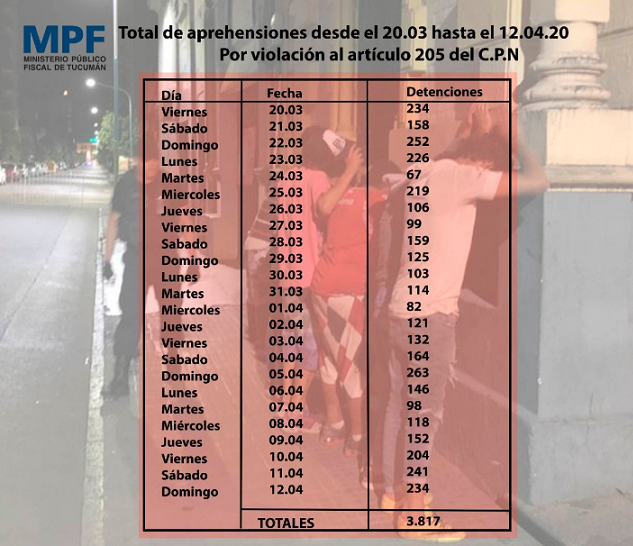 Entre este sábado y domingo, 475 personas fueron detenidas en Tucumán violaron las normas de emergencia sanitaria. El Ministerio Fiscal comunicó que, a la fecha, hay 3.817 detenidos, y 1.298 vehículos retenidos por circular sin justificación alguna.