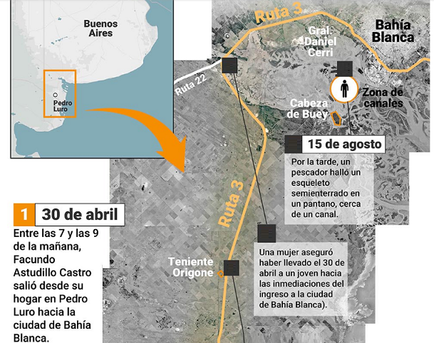 Los restos esqueléticos fueron encontrados en un cangrejal, a varios metros de la ruta 3, cerca del límite con Bahía Blanca. Astudillo Castro, de 22 años, permanece desaparecido desde el pasado 30 de abril, cuando emprendió un viaje a dedo desde la localidad de Pedro Luro hacia la casa de su ex pareja en Bahía Blanca.